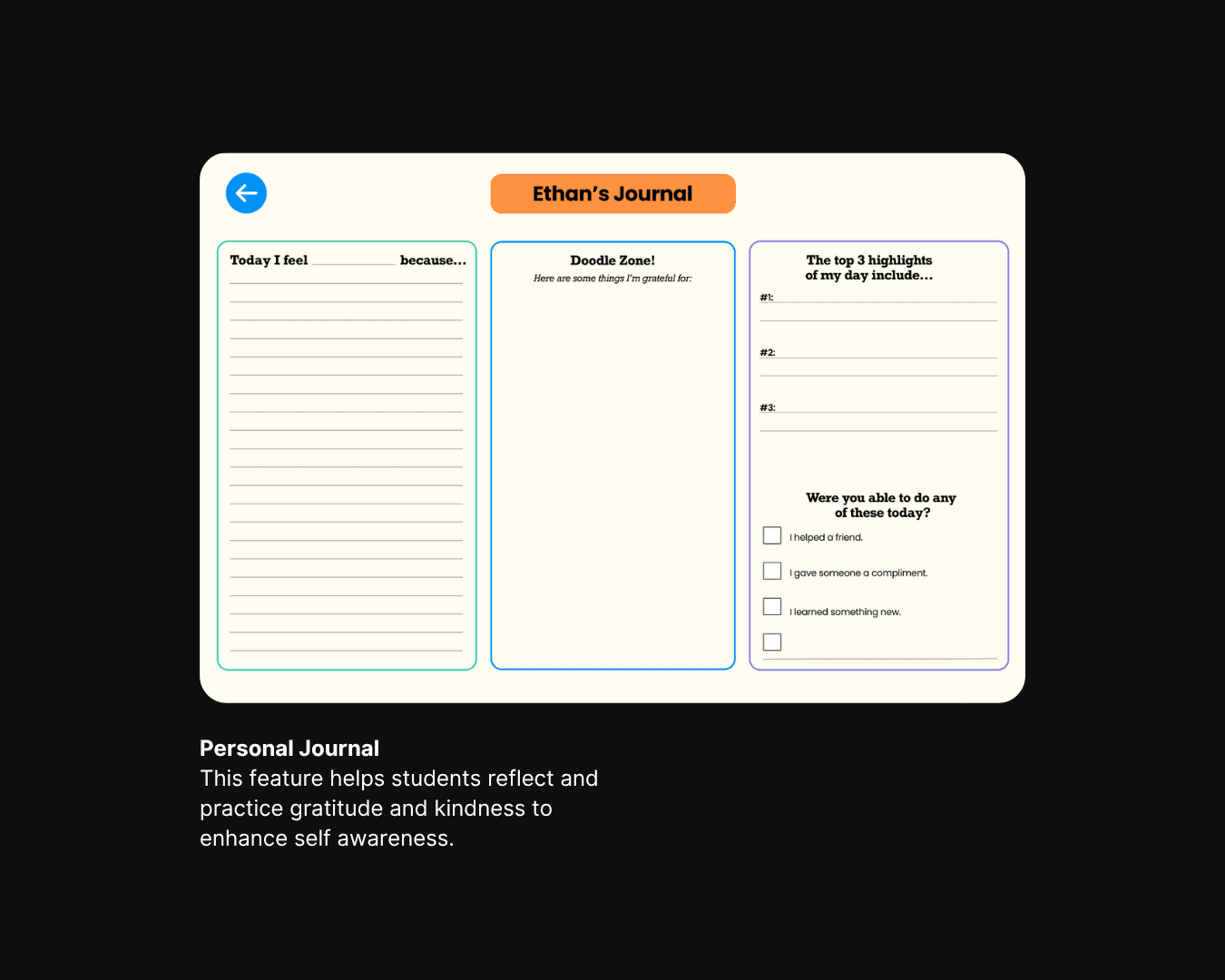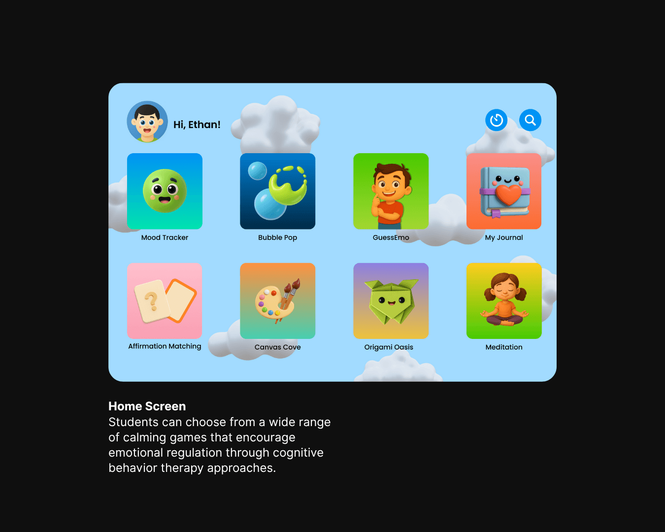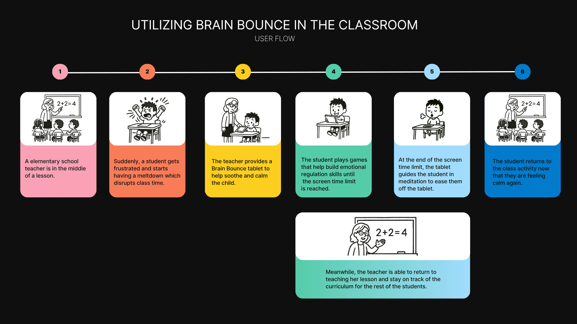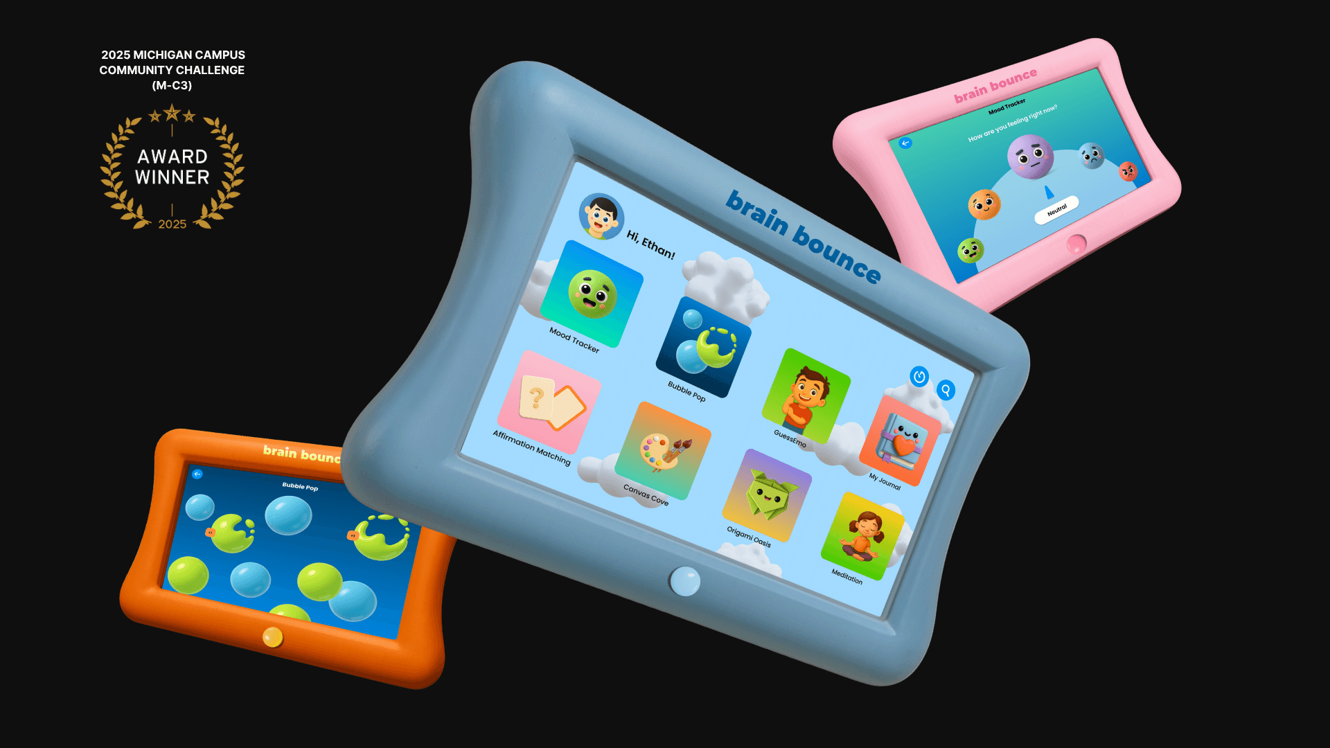 BrainBounce is an affordable digital tablet designed to support children experiencing emotional dysregulation. The concept was inspired by the experience of a public primary school teacher in Detroit who struggled to find effective tools for managing student meltdowns in the classroom. Through interviews with teachers across the Midwest, the challenge became clear: how might we empower educators to support elementary students with emotional regulation during meltdowns in a way that minimizes classroom disruption?